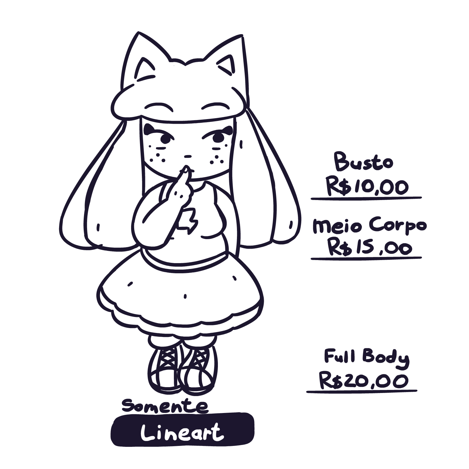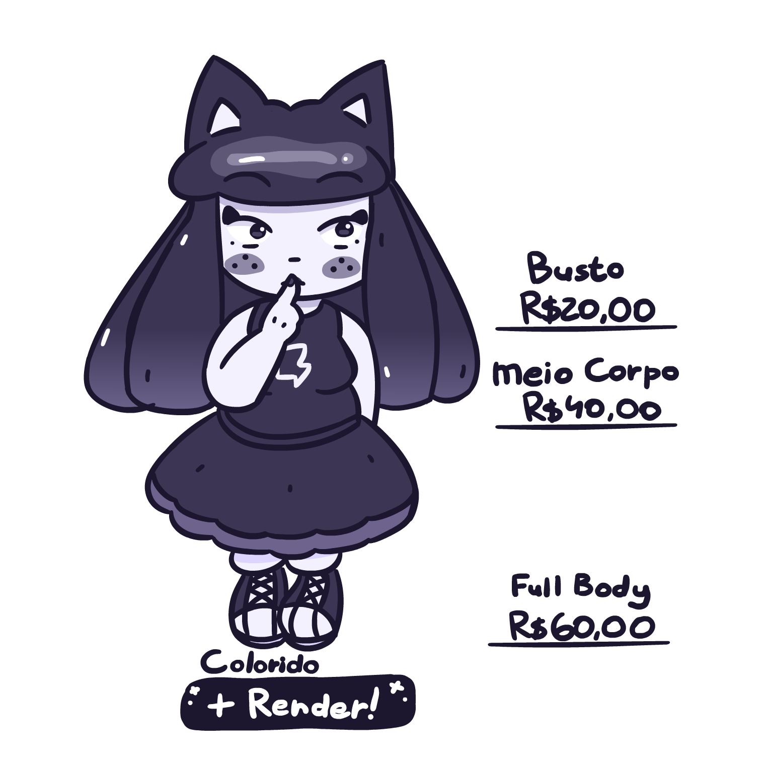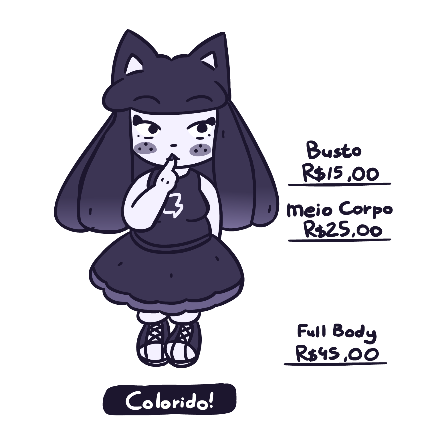 - Antes de iniciar, é necessário você já possuir uma referência do personagem, pose, e da expressão que você deseja;- O processo leva em média de 3 à 4 dias para ficar pronto;- Durante o processo, será encaminhado imagens com o progresso do desenho, para que você possa avaliar, e comentar possíveis alterações que você desejar;- Após a aprovação do sketch, será iniciado o processo de lineart. Nessa parte, não será possível fazer modificações no desenho, caso contrário, será cobrado um valor extra de acordo com a modificação;- Referente ao texto anterior, caso você tenha solicitado as opções Colorido ou Colorido + Render. Será possível fazer alterações nas cores com nenhuma cobrança extra;- Ao entregar o produto final, será perguntado se você gostaria que o desenho seja divulgado no momento, ou se deve ser divulgado apenas depois de uma certa data.